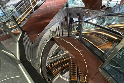 アーバン・コアとは、地下と地上をエスカレーターやエレベーターなどでつなぐ縦軸空間のこと。駅周辺のみならず、起伏の激しい市街をストレスなく移動するため(バリアフリー視点も含め)には、地下通路からスカイウエイ(空中デッキ)までアーバン・コアをつなぐことが必須でした。渋谷マークシティや渋谷ヒカリエの既設アーバン・コアに加え、渋谷ストリームと渋谷スクランブルスクエアにも新しいアーバン・コアが設置されたことで、JR線と東急線東横線の乗り換えは格段に楽になりました。