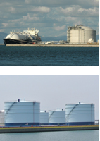 また、産学官連携で世界初の取り組みとなる"高温超電導直流送電システムの実証"を行う研究地として石狩湾新港地域が選定。同研究は省エネルギーの先端となることから、次世代の石狩湾新港の顔となることが期待されています。(写真:LNG船とLNGタンク・石油貯蔵タンク)
