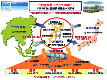 2015年7月現在、沖縄県を中心に、首都圏、香港、シンガポールを海底光ケーブルで結び、県内データセンターと沖縄IT津梁パークなどを一体化させたクラウドネットーワーク環境の構築化が拡大進行中とのこと。情報産業振興課は「10年後に生産額5,800億円、雇用者数55,000人を目標とした"おきなわSmart Hub構想"で、広く国内から企業・人材・情報が集積する"アジア有数の国際情報通信ハブ"を実現させたい」と抱負を語ります。