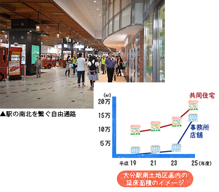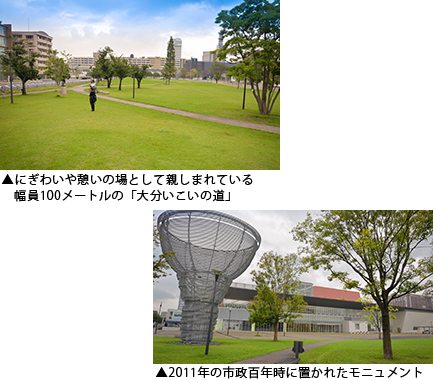 それまで駅南側は、国鉄の鉄道操車場や鉄道病院跡地、木造住宅など利用の低い土地や空き地が多数点在していましたが、、再開発では、全国でトップクラスの幅員 100メートルの緑のシンボルロードを誕生させます。現在「シンボルロード"大分いこいの道"は、緑溢れる芝生広場を有する新たな市民の活動拠点であり、にぎわいや憩いの場として親しまれています」、「文化施設としてホルトホール大分も完成させました」。その結果として「周辺には住居用マンションなどが増え、街の付加価値向上に繋がった」と総合整備課は語ります。