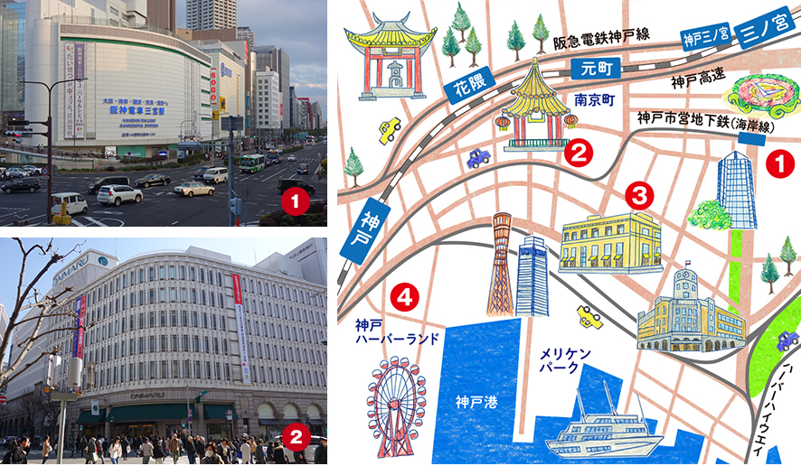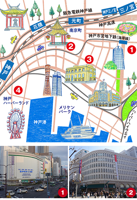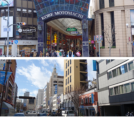 新幹線停車駅の新神戸から市営地下鉄でひと駅。交通や経済などあらゆる面で"神戸の玄関口"となる三宮は、市内髄一の企業集積地区と言えるでしょう。駅南口には昭和8年の竣工以来、三宮のランドマークとなってきた百貨店「そごう」が構え、ここを起点として港に向けて伸びるフラワーストリートが国際都市神戸のビジネスエリアを象徴する"表の顔"となっています。