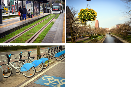 さらに中心地を活性化させるために、このセントラムが走る沿線の環境づくりにも重点を置いています。市内街路にはガラス彫刻が並びます。ヨーロッパの都市のように、いたるところにフラワーバスケットがあり彩りを添えます。軽快に走り抜けるセントラムの車両は質の高いデザインで目を引きます。コンパクトシティの一環としてバイクシェアリング(LRTとのスムーズな連携を図る自転車を貸し出すシステム)サービスの拠点が環状線を中心に18カ所設置されています。