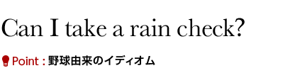 "rain check"とは、野球の試合が雨などで順延になった時、別の日に試合観戦を振り替えできるチケットのこと。そこから転じて、何かのお誘いがあった時に「その日はダメだけど、別の日なら行けますよ」と伝えたいときに使われます。申し出を受け入れる気持ちがあることを示す、ポジティブな言葉です。Can I take a rain check?
