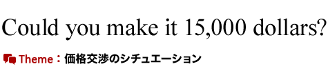 make itは一般的に「作る」と訳されますが、このほかにも、実現させる、構成する、正しくする、など、ビジネス英語では必須の多用される動詞です。この例文では、こちらの事情や条件に合わせて、「融通を利かせて欲しい」「やりくりして欲しい」などの意味となります。Could you make it 15,000 dollars?