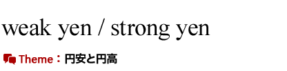 円相場の話をする場合は、weak(弱い)とstrong(強い)を使って円安・円高を表現するのが一般的です。weak yenは、経済の停滞が続く日本において、「円」が他の通貨よりも価値が下がり"弱まりつつある"状態を言い表した言葉です。円高:strong yen