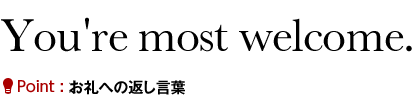 こうした時、相手からの「Thank you.」に対する返し言葉としては「You're welcome.」が学校で習う英語としては一般的ですが、状況によって言葉を使い分けるのがデキるビジネスマンです。