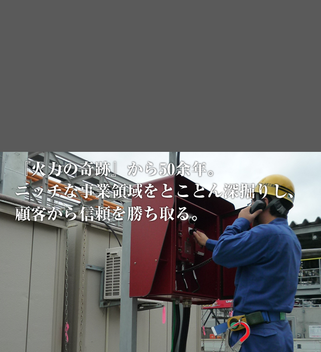 創業当時のスタッフはわずか7名。この規模の企業が登録会社となったことは『火力の奇跡』と語られた。一方、「正直に仕事をすれば、必ずお客さまに受け入れられる」という姿勢を貫き、まずは目の前のお客さまのために技術力と提案力を磨き、機動力を向上させ、原子力発電が電力供給のメインストリームになった以降も篤い信頼関係で結ばれている