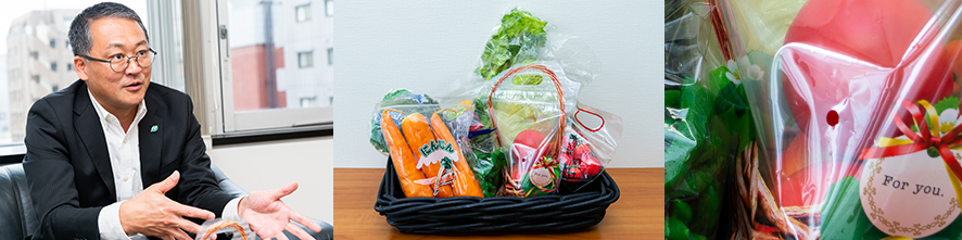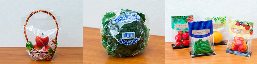 そしてこの頃開発されたのが、"機能を持った農産物のフィルム包装"だ。スーパーマーケットの販売はバラ売りではなくパック売りが基本。しかし、普通のビニール袋に詰めて陳列してしまうと、袋の中で水分が蒸散して品物が痛んでしまう。そこで、ビニール袋に小さな穴を開けて野菜が呼吸できるようにすることで食の安心・安全を保持させた。これは実用化と共に、全国のスーパーマーケットで採用された。