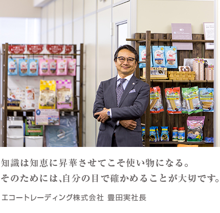 「私どもの新機軸としては、これからは自社で企画したものを、外部の協力会社とタッグを組んで製造してオリジナル商品を市場展開させていこうと考えています。もちろんそれは、ペットの高齢化対策商品も含む、衣食住すべての商品においてです。そのためには、エコートレーディングの企業資産を改めて見直して、これまで機能していなかった部分のテコ入れをする必要性があります。