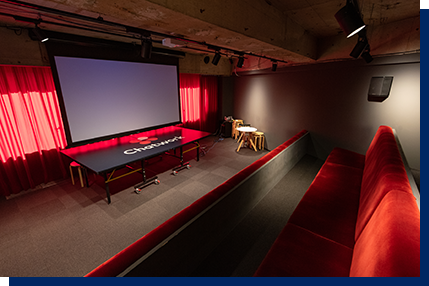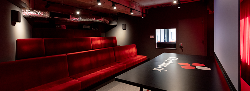 シアタールームはちょっとした小劇場で、使い勝手も多岐にわたります。会議室としての利用はもちろん、勉強会やセミナー、記者発表など事業にかかわるもののほか、終業後には会社の部活動(映画部や軽音楽部)が防音設備の利点を活かしておこなわれています。また、先ごろのラグビーワールドカップ時には、スクリーンの前でお酒を片手に大いに盛り上がっていたのだとか。こうした仕事以外の使い方が会社の中にコミュニケーションの輪を幾重にもつくり、社員の満足度や職場の快適さにもつながっているそうです。