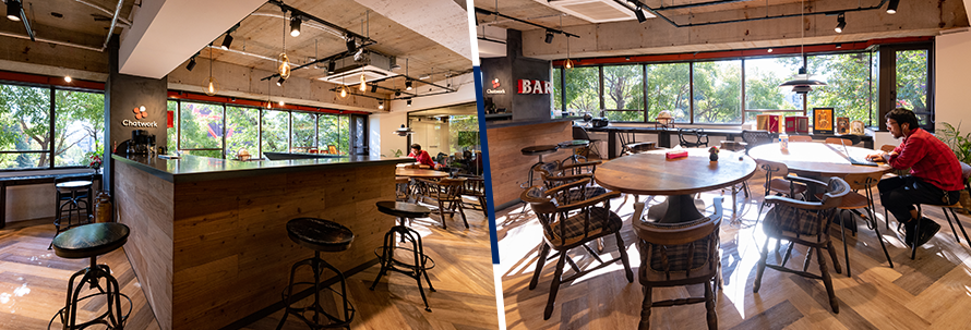 5階執務フロアは、入り口を入ると左側に開発のエリアが、右側にはビジネスのエリアがあり、その中央に広いカフェスペースを設けるという大胆なレイアウトになっています。この理由は「チャットサービスを提供する会社だからこそ対面でのコミュニケーションが大事」という考え方が根底にあり、中央にカフェスペースを置くことで、普段は顔を合わせぬ双方エリアの社員同士が交流することで、ひと時のくつろぎを得るだけではなく、ビジネスを加速させるヒントも生まれるといいます。このエリアの魅力は、社内コミュニケーションの活性化だけではありません。夜になるとバーカウンターでお酒を飲んで、ほろ酔い加減で退社するなんとも幸せな社員もいるそうです。