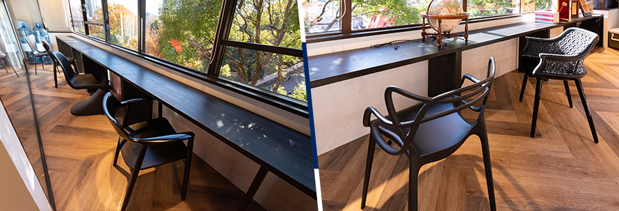 カフェエリアの西側、東京タワーを望む一角にはカウンター席が設けられ、ズラリと世界の名作チェアが並んでいます。色合いこそ黒一色で統一されていますが、デザインは一つひとつが個性的で座り心地もそれぞれです。時には気分を変えて、自分のデスクを離れてお気に入りの椅子を選んで座り、仕事に勤しむ社員も少なくないそうです。