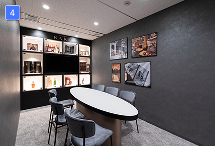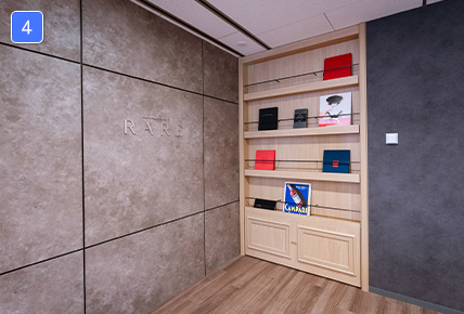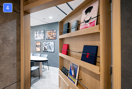 CAMPARI GROUPで取り扱うブランドの中で、一部の高額商品については「RARE(レア)」という名目でカテゴリー分けしています。こうした稀少商品の商談をおこなうのが、ブックスタンドの向こうに設けられた応接室「RARE ROOM」です。一見何の変哲もないブックスタンドが、実は隠し扉になっているというなんともユニークなオフィス設計で、スタンドの左側を押すとまさしく高額商品の取引に相応しい"重厚感のある小部屋"が現れます。