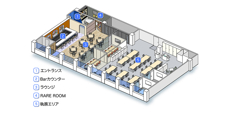 「営業にしてみれば、せっかくお客さまにお越しいただいたのだから"Wow!"と驚いていただきたい。coolでオーセンティックなBarやスピークイージー的な隠れ部屋のつくりの設置も、移転プロジェクトのメンバーがアイディアを出し合い、本気になって取り組んだ結果の賜物です」。