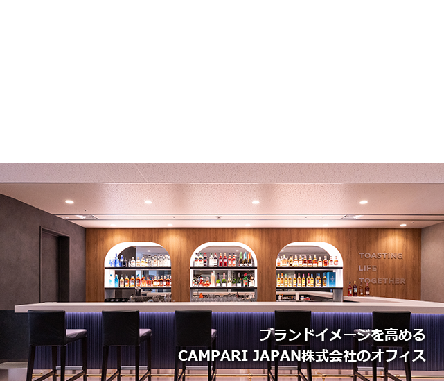 Barカウンターの設置はCAMPARI GROUPからのマストな要望。カウンターデザインは各国それぞれですが、すべからくオフィスにBarを設けて、CAMPARIブランドの歴史や思想をエディケーションする場にしたり、カクテルのつくり方をデモンストレーションする「CAMPARI ACADEMY」を開催するなど、単なる社内交流やリフレッシュスペースとしてではなく、Bar文化を継承する実践の場であり、CAMPARIブランドのアイデンティティを象徴したオフィスの心臓部になっています。