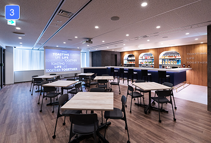 オフィス選びにおいては押さえるべきポイントが3つあったと阿部氏は言う。第1はオフィスの規模感だ。約50人の従業員が一緒に働ける執務エリアを確保出来る広さであること、これを大前提にオフィス探しは始まった。第2は利便性の良さ。前オフィスは7つの駅が利用出来たが、全ての駅が徒歩12分以上と営業泣かせの距離。「移転先は、ぜひとも駅の近くにして欲しい」というのは従業員の総意でもあった。第3はマストな条件としてBarの設置が可能であること。その場合に問題になるのが給排水で、一般的なオフィスビルの場合、Barの給排水が許容出来るほどの物件は多くない。事実、給排水がネックとなり候補から外したビルもあったと言う。
