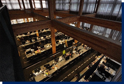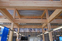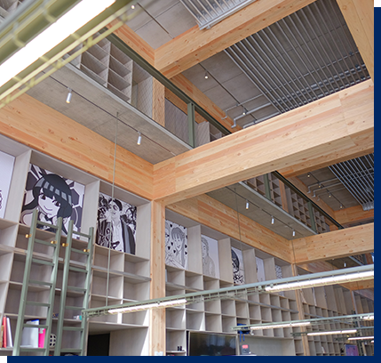 住宅用アルミサッシを使用したことで、外観ファサードに面白い効果が生まれました。窓列が7層あるため、一見、多階数の印象を与えますが、実は2階建てです。実際には4階建てでも十分な高さは確保できますが、スタッフがのびのびと働けるよう1階の天井高を思い切って高くしました。また、オフィスビルの建築で重要課題となる耐震性については、構造設計の段階で、鉄骨造と木造の組み合わせで構成する『木質ラーメン構造』を採用。かなり難易度の高いチャレンジングな試みだったようですが、ブレースや筋交いがが露見することもなく耐震性をクリアして、柱と梁の構成でシンプルな大空間が実現しました。