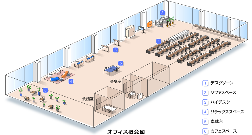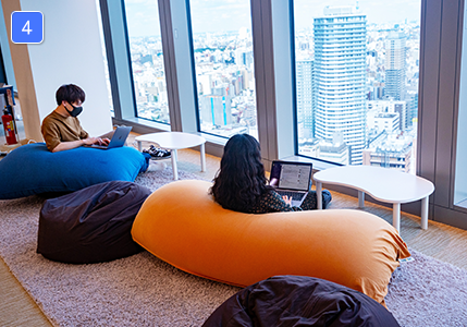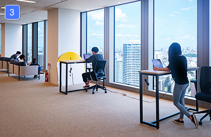 オフィスの南側には、全面窓から東京の街を見晴らすようにして、ソファースペース、ハイデスクや個室型ワークブースが置かれた個人集中スペース、靴を脱いでくつろぎながら仕事ができるリラックススペースといったタイプの異なるワークスペースが設けられています。フリーアドレスをバックボーンに、個々人がそれぞれにフィットした働き方を選択できるようなオフィス設計になっています。