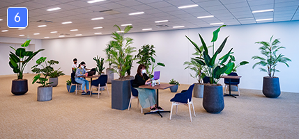 東側の観葉植物で囲われたエリアはカフェスペースと位置づけられ、スタッフが食事を摂ったり、軽い打ち合わせをしたり、ワークスペースとしても利用されています。一般的なオフィスの場合、エントランスや執務エリアの随所に緑が配置されているものですが、タイミーの場合、緑を配しているのはこのスペースとソファースペースの目隠しだけ。そんな希少性がカフェスペースの存在を却って際立たせ、広大な砂漠の中にある"オアシス"といった風情を醸し出していました。