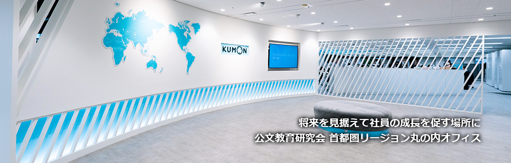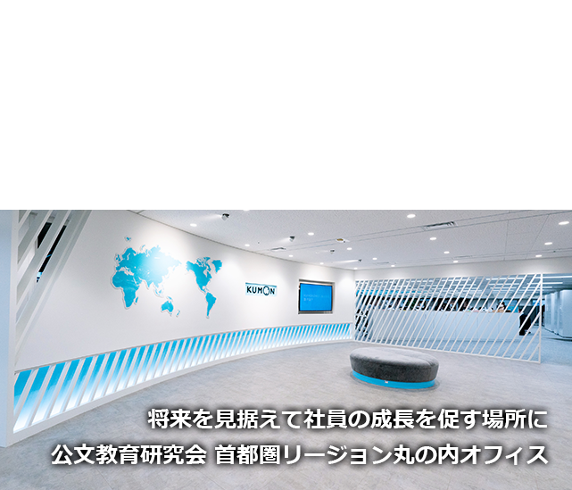 アピールポイントは「世界への広がり」。グローバルな展開が難しいと言われる教育業界にあって、60を超える国と地域に"学び"を届ける『KUMON』は、今や世界の共通語となっています。その誇りと自信は、エントランス正面に設置された世界各地の拠点を示した世界地図が象徴しており、コーポレートカラーのKUMONブルーのあしらいが清潔感を醸成しています。