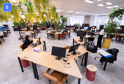 「部門を超えたコミュニケーションは活性化するものの、自部門内のコミュニケーションが希薄になるのでは」との声に対しては、部門ごとにメンバーが寄り合い仕事ができるハブ(中央に植栽が配された座席がハブの役割を果たす)を設置しました。このハブの存在が部門内コミュニケーションの活性化に貢献しています。