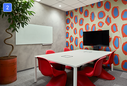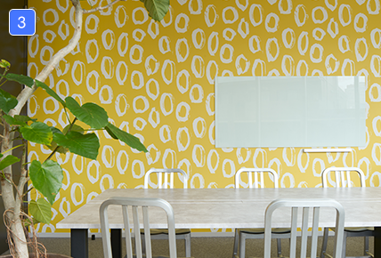 コロナ禍においては、会議室を利用する頻度は減少傾向であったものの、アフターコロナで出社率が増えてきた今、会議室がオフィスの中で果たす役割は重要です。とはいえ、どの会議室に入っても同じような空間ではユニークさに欠けます。新オフィスの会議室(5室)は、「クリエイティブな発想はオフィス内の素材からも刺激を受けて生まれる」といった考えのもと、それぞれに壁紙や椅子のデザイン、さらにはグリーンに至るまで様々な種類を組み合わせ、アイディアが生まれやすい空間づくりが成されています。
