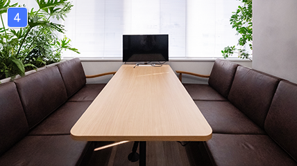 一見同じように見える商談スペースですが、実際には机と椅子の高さが異なっていて、座る場所によって視界の広がり方が変わります。これも「感覚の仕掛け」のひとつで、居心地の良い空間づくりに一役買っています。