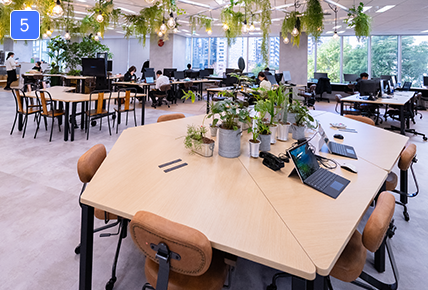 執務エリアはフリーアドレスを導入しています。開放的な空間にすることでフレキシブルな働き方を可能にすると共に、日々異なる顔ぶれと交流が生まれるようにしています。気づきやひらめきを誘発し、イノベーションにつなげることが狙いです。