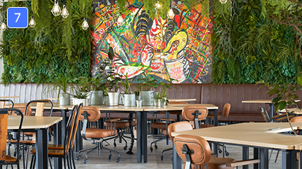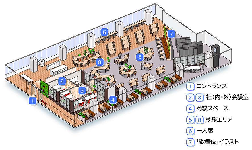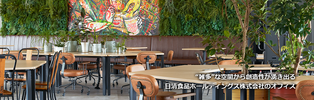 オフィス内には多彩な色をちりばめることで雑多な空間を構築しています。加えてオフィス内の壁面には当社の「VALUE CREATION BOOK」(価値創造ブック)の表紙となった「歌舞伎」のイラストを掲示して日清食品グループらしさを演出しています。