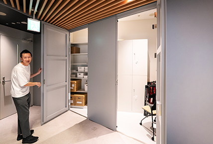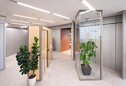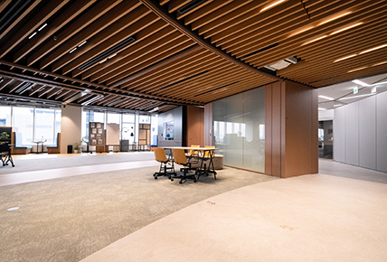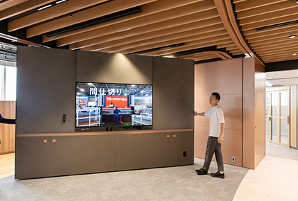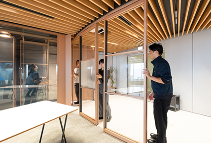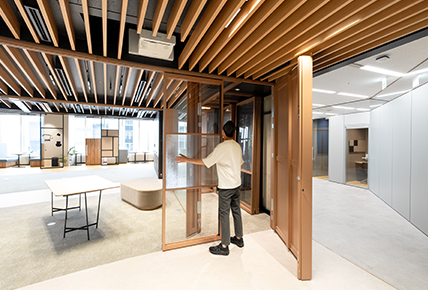 社員が増えたり新たなプロジェクトが立ち上がったり、状況に応じて変化が求められるオフィスレイアウトを、大掛かりな工事や時間を必要とせず、スムーズな操作で実現できるランニングウォールの可能性を実感できるエリアです。