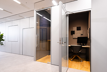 ミーティングの最中、外のノイズが聴こえてくれば話し合いに集中できなくなります。逆もまた然りで、情報漏洩の危険性も無視できません。特に人の出入り口は隙間が生まれやすく、これまでは「デザイン性を考えれば引き戸が良いが、遮音性が確保しにくいため採用を見送る」というケースが多々ありました。こうした防音対策の問題点を、小松ウオール工業はデザイン性と遮音性を兼ねた「マイティスマートレール」に、ダブルガラスパーティションとセミエアタイトの引き戸を用いることで解消。意匠性の高い防音対策で、使い勝手の良いミーティングルームを構築しました。