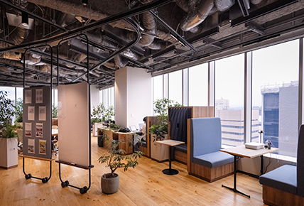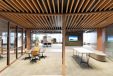名古屋のランドマークとして市内西部を見渡すパノラマビューが広がる窓側エリアに位置するワークスペースには、オフィスのモードに合わせてパネル面(ピンナップボード、マーカーボード)が自在に付け替え可能なパーティション「corocoro(コロコロ)」などのアジャイルな製品を配置。空間をゆるやかに仕切って視線を遮り、大小さまざまなワークスペースやコラボレーションスペースをスピーディに作り上げることができる仕様になっていました。