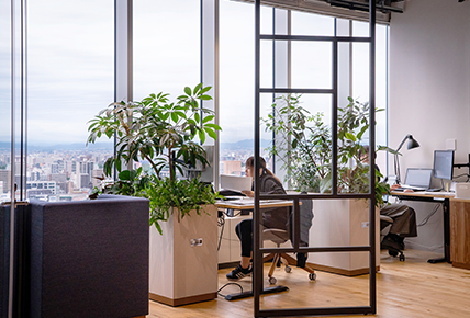 しかしながら、ライブオフィス化するということは、社員は常にお客さまに意識を払いながら仕事をするということであり、営業だけでなく、設計、事務、経理などの内務の社員も緊張感の高い状況が続きます。そのため、緑視率を高めたり(緑視率が高いとコルチゾールというストレスホルモンの分泌を抑える効果が期待できる)、視線のコントロール(不定期なオフィス什器のレイアウト変更)をおこなってストレスが軽減できるよう努めています。