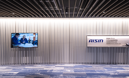 第1は、グローバルサプライヤーとしての技術力やグループの一体感を訴求する場とすることです。具体的には、AISINロゴやカンパニーカラーである藍色を取り入れ"アイシンらしさ"を視覚的に表現しました。第2に、会社紹介の場としての機能です。モニターを設置して会社の理念や起源、CM映像を放映することで、訪れた方に会社の歩みと想いを自然に伝えられるようにしています。第3には、製品紹介の場としての役割を付加しています。製品紹介ビデオに加え、実機やモックアップを展示することで、事業を直感的に理解していただける構成に。アイシンの魅力と未来志向を象徴する空間となっています。