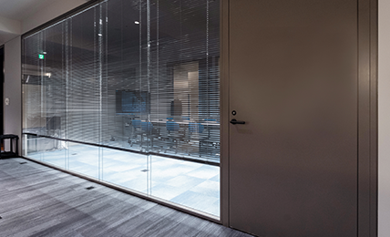 さらに機密性を確保しつつも、室内利用者の安全確認が室外からもできるよう、ガラススリット入りのドアに交換したり、既存のブラインド内蔵型ガラスフォールは下50㎝を開けるルールで運用しています。これは移転前のオフィスで、完全に閉ざされた部屋で社員の異変に気づけなかった経験を踏まえた設計であり、安心と利便性の両立を意図したものです。