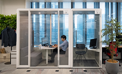 執務エリアにおける多様な働き方を支える仕組みの一つとして、テレブースや集中ブースが設置されています。これは、周囲の音や視線を気にせず業務に没頭したいという従業員のニーズに応えたもので、通常のオープンスペースでは得にくい高い集中環境を実現し、日常業務での効率化向上に寄与しています。
