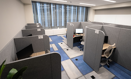 ラウンジに加え、集中ブースの半分は、本社や他拠点からの出張者のサテライトオフィスとして利用できるようになっています。