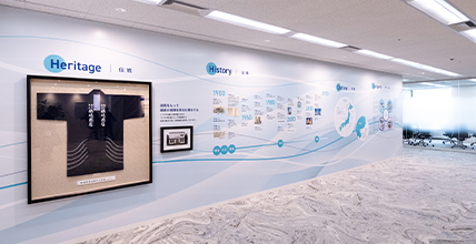 本社のエントランスを入ると左手には、ナラサキ産業120年の歴史を物語るヒストリーウォールが設けられています。