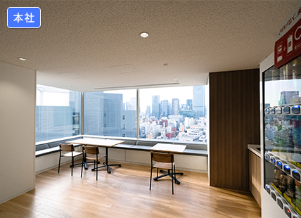 本社では、各階フロアの南北のブランクスペースをリフレッシュコーナーとして、窓外の景観を楽しめる開放的な空間をつくりあげています。スペース内には自動販売機と椅子を備え、執務エリアとは異なる時間の流れを感じられる環境に。業務の合間に自然な「間」を生み、オンとオフの切り替えを促しています。