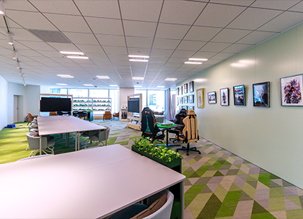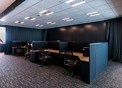 執務エリアは、開発フロア(電源増強したフロア)とそれ以外のフロアとでデスク形状が異なります。開発フロアは、ゲーム開発に最適なゾーニングが計画されています。特に開発フロアでは業務特性に応じた環境づくりを徹底。最大の特徴は、「静(Quiet)」と「動(Active)」を明確に分離した構成です。Quiet側には、ゲームの色味を精緻に確認する作業など高い没入感が求められる業務に向け、暗幕室のような集中環境を整備。