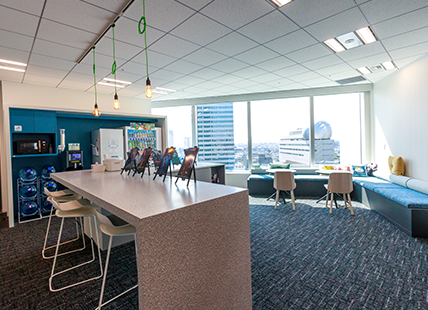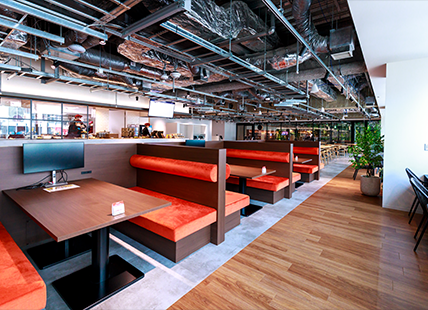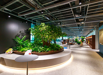 社員の憩いの場であるラウンジには特別な想いが込められています。新宿オフィスで親しまれた社員食堂「Lounge」の名を継承し、渋谷にそのまま「転生」。その居心地の良さから人気スペースとなっております。また、ラウンジ向かいには、自然と一体化したような開放感を与えるコミュニケーションスペース「Garden」が。伝統を受け継ぎつつ進化したLounge&Gardenエリアは、部門を超えた交流を支える重要な拠点です。