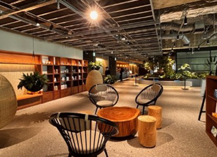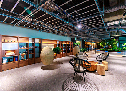 エリア内には、自社の魅力を発信するライブラリーや展示スペースも設けており、社内外の感性が交差する拠点となっています。