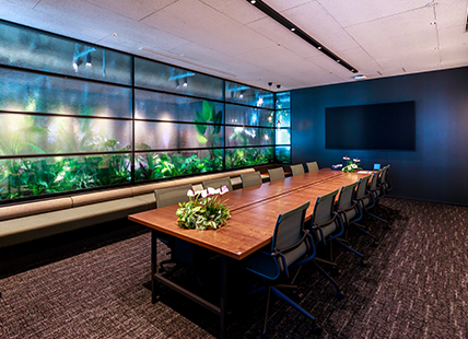 機密情報の保護を最優先する事業の特性に合わせ、会議室はクローズドな個室をメインに配置しています。セキュリティの観点から個室ニーズは非常に高く、一部のオープン型スペースと使い分ける構成としています。運用面では、顔認証付きの予約システムを導入。「空予約」を防止し、スペースの有効活用を徹底しています。また、9階の応接室はガラスパーテーションで開放感を出しつつ、特殊なフィルム加工を施して外部からモニター画面の視認を遮断。意匠性と強固なセキュリティを高度に両立させた設えとなっています。