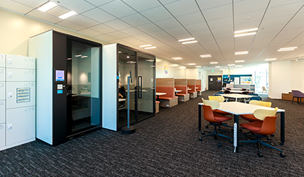 運用面では固定席を主軸としつつ、窓際一帯を自由に働けるABWゾーンとして開放。ビデオ会議に対応した高遮音性間仕切りやホワイトボード、飾り棚など多様な機能も備えています。