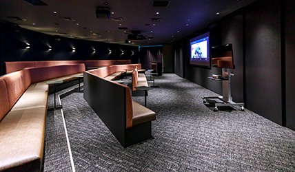 約40名収容可能なプレゼンテーションルームでは、4Kの大型プロジェクターと7.1chの音響設備を完備し、高品質な映像と音響で最新ゲームの発表会や、プロモーション映像のレビュー会などをおこなうことができます。